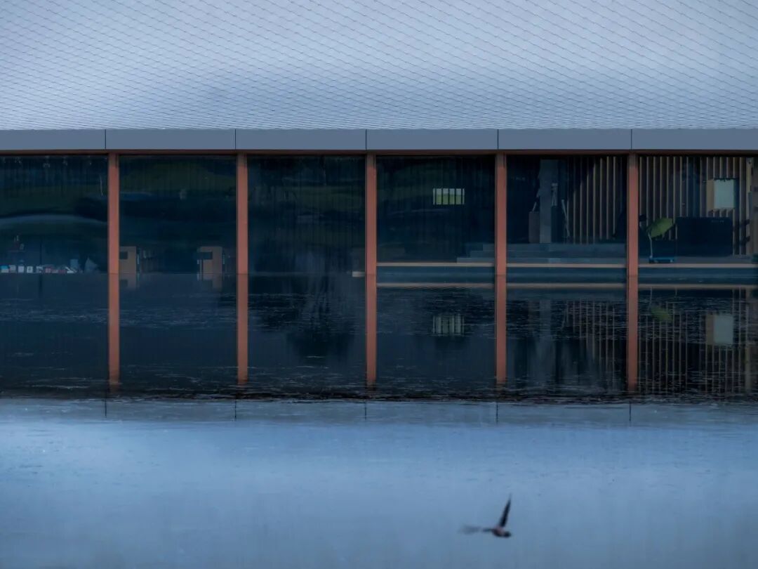 ©形在摄影HereSpace建筑物体与开阔的湖面相连。临湖侧玻璃玻璃幕墙延伸至水下,为室内下沉写作空间引入柔和的水光,烘托出灵动、美好的空间情绪。