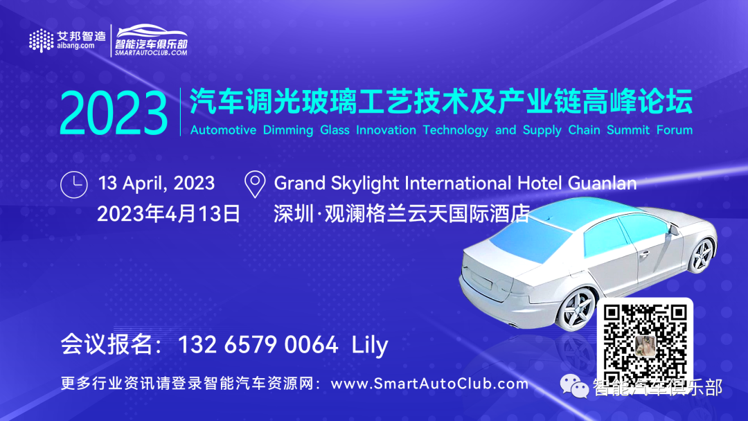 扫描上方二维码即可在线报名活动推荐二:电动汽车智能化调光玻璃产业高峰论坛(4月13日 深圳)