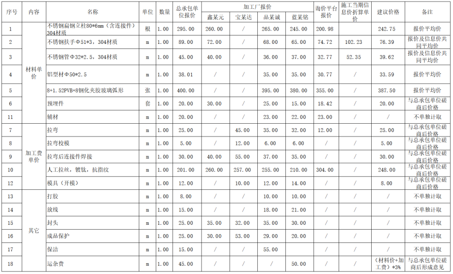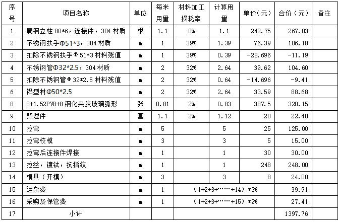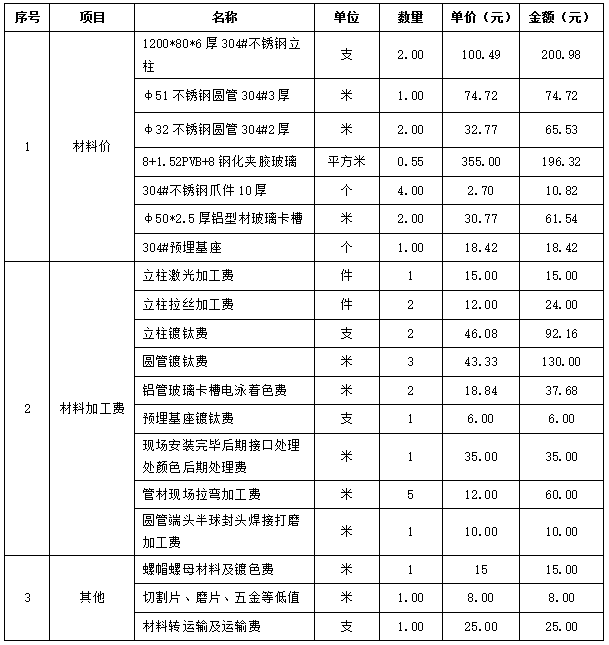 如“半圆形耐火地板石栏8mm+1.52PVB+8mm”,先将该项成本金属材料分解为半圆形耐火地板(8mm+1.52PVB+8mm)、304#不锈钢圆管扶手(φ51*3mm)及304#不锈钢立柱(80*6mm)等金属材料。