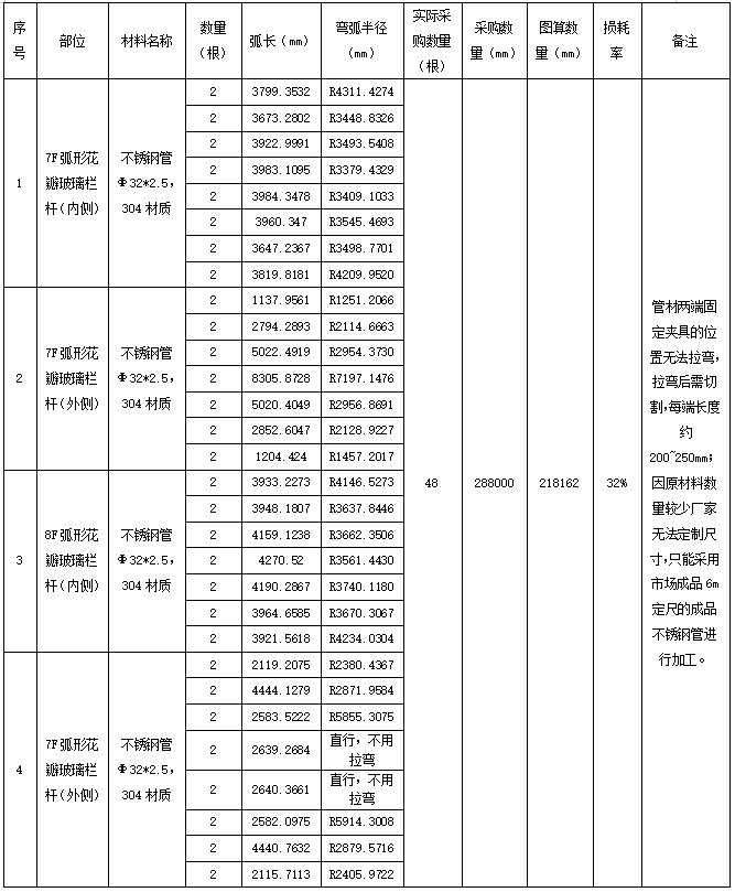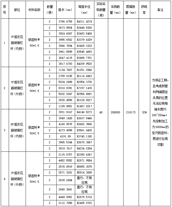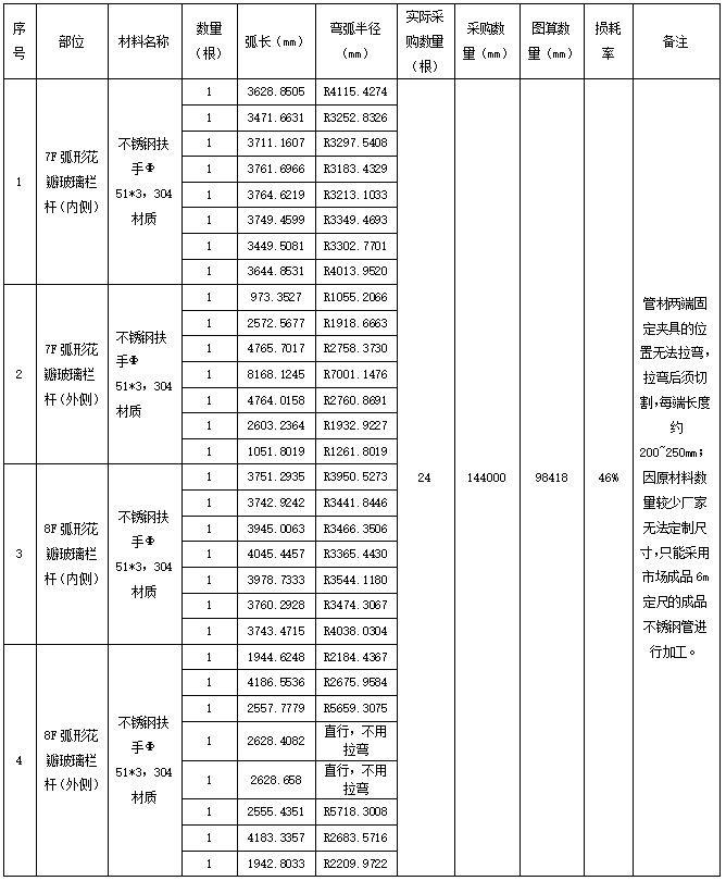 以7F半圆形花朵地板护栏为例,共有29个规格合计50张地板一个花朵有3张地板,一个半径,每个花朵不同半径,厂家需要根据不同半径来调整热弯机械的弧度,一次热弯只能处理一个半径和3张地板 4.3 计算半成品金属材料研磨损耗率。