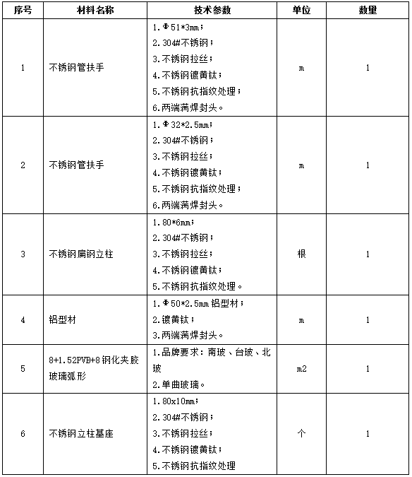 同样以“半圆形耐火地板石栏8mm+1.52PVB+8mm”为例,除掌握地板的厚度、耐火的厚度及材质外,还应明确地板是否为半圆形,是专辑或射影,每片地板弧度是否相同;掌握立柱、扶手、爪件的材质、厚度、颜色及研磨明确要求等(如抗指纹处理)。