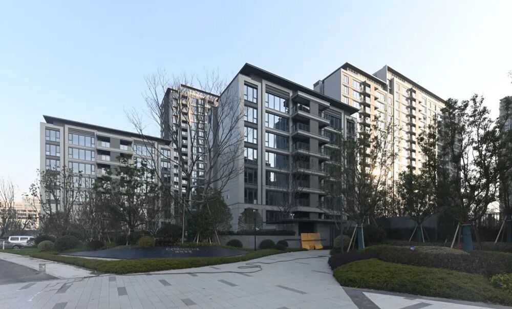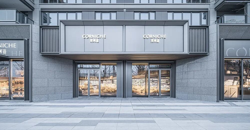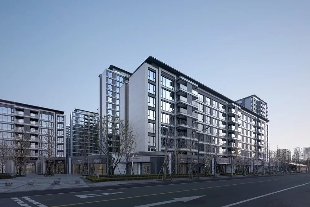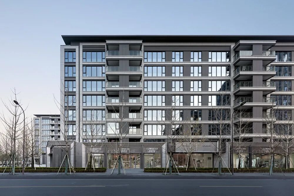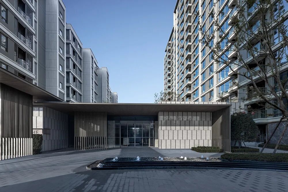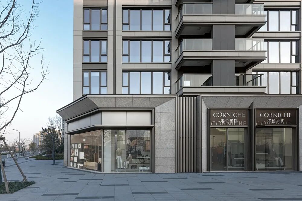 住宅基座干挂蓝眼睛石材,以极小尺度的铝型材作为勾勒与点缀,没有堆砌细节,而是恰到好处地点出品质感。