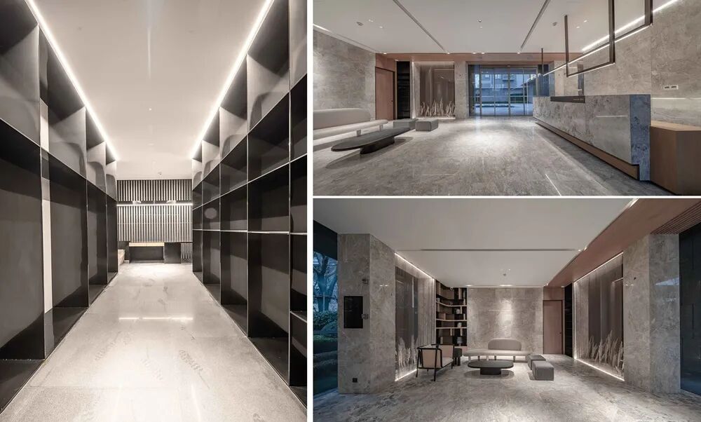 地下内部空间的结构设计突出友好、便捷、安全的结构设计准则,大堂前区划线+吊顶结构设计+暖光源照明变化,加强提示性;有结构设计的地下大堂可提升业主归家的仪式感。