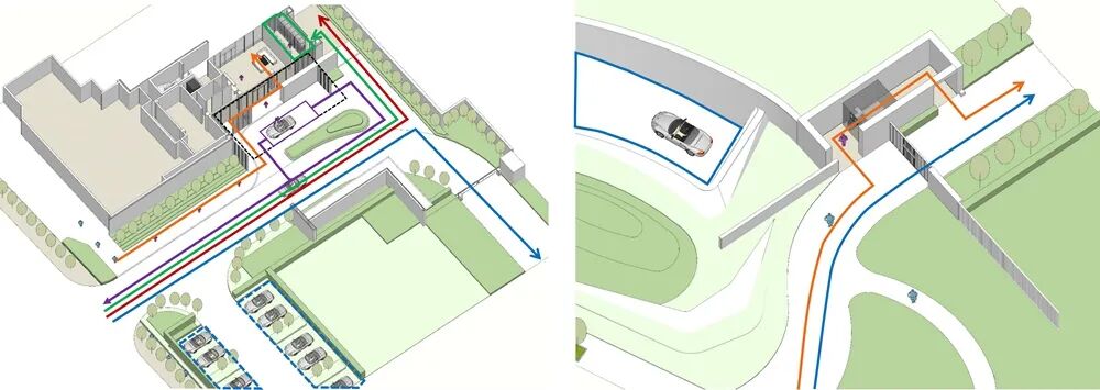 ▲建筑物地下归家动线结合街道社区出入口无雨落客和连通地下室的电梯,为业主提供无雨归家体验地下归家动线不仅注重入库坡道和导视标识系统的人性化结构设计,同时,采用地面划线+提示牌标识路径位置,辨识度高,旨在从心理层面和技术层面的落实健康居住的理念。
