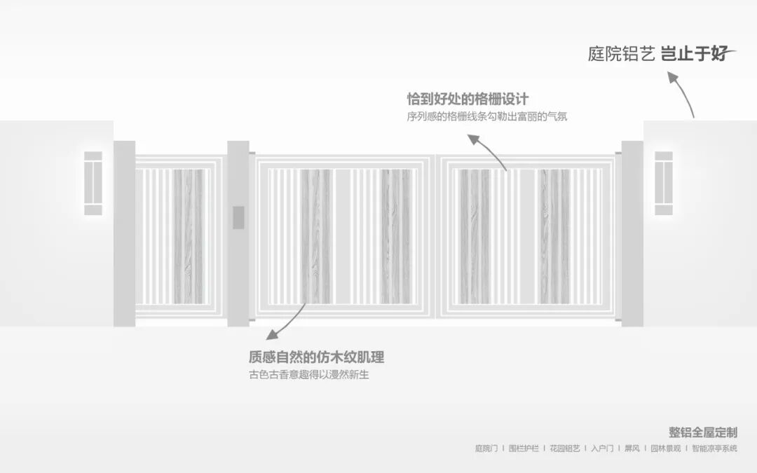 事例名称 / 公安部门雅居乐雅居乐 工程项目地点 / 武汉市 公司出品结构设计 / 家运出铝艺 工程项目应用领域 / 整铝木门订制囊括: 回廊门 I 栅栏栏杆 I 花园铝艺 I 门旁 I 扇面