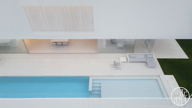 室内延续极简的结构设计,一如既往的干练单纯。一层作为起居空间,面向泳池一面是大面积玻璃移门,使室内空间向外开放,在视觉上也起到增大空间面积的效果。