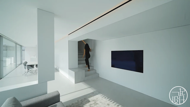客厅墙面与天花板都采用极净的白色,顶部边沿处做暗藏式灯带结构设计,给空间增添照明与氛围,照映在灰色的水泥自流平地板与台阶上都显得不那么不冷峻暗沉了。